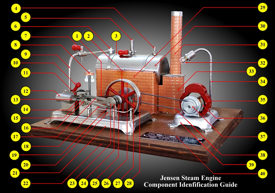 31 -- Stack 32 -- Incandescent Light Bulb 33 -- Stack Base 34 -- Lamp Post 35 -- Generator Magnet 36 -- Generator Armamture 37 -- Generator Drive Pulley 38 -- Generator Drive Belt 39 -- Generator Base 40 -- Engine Data Plate